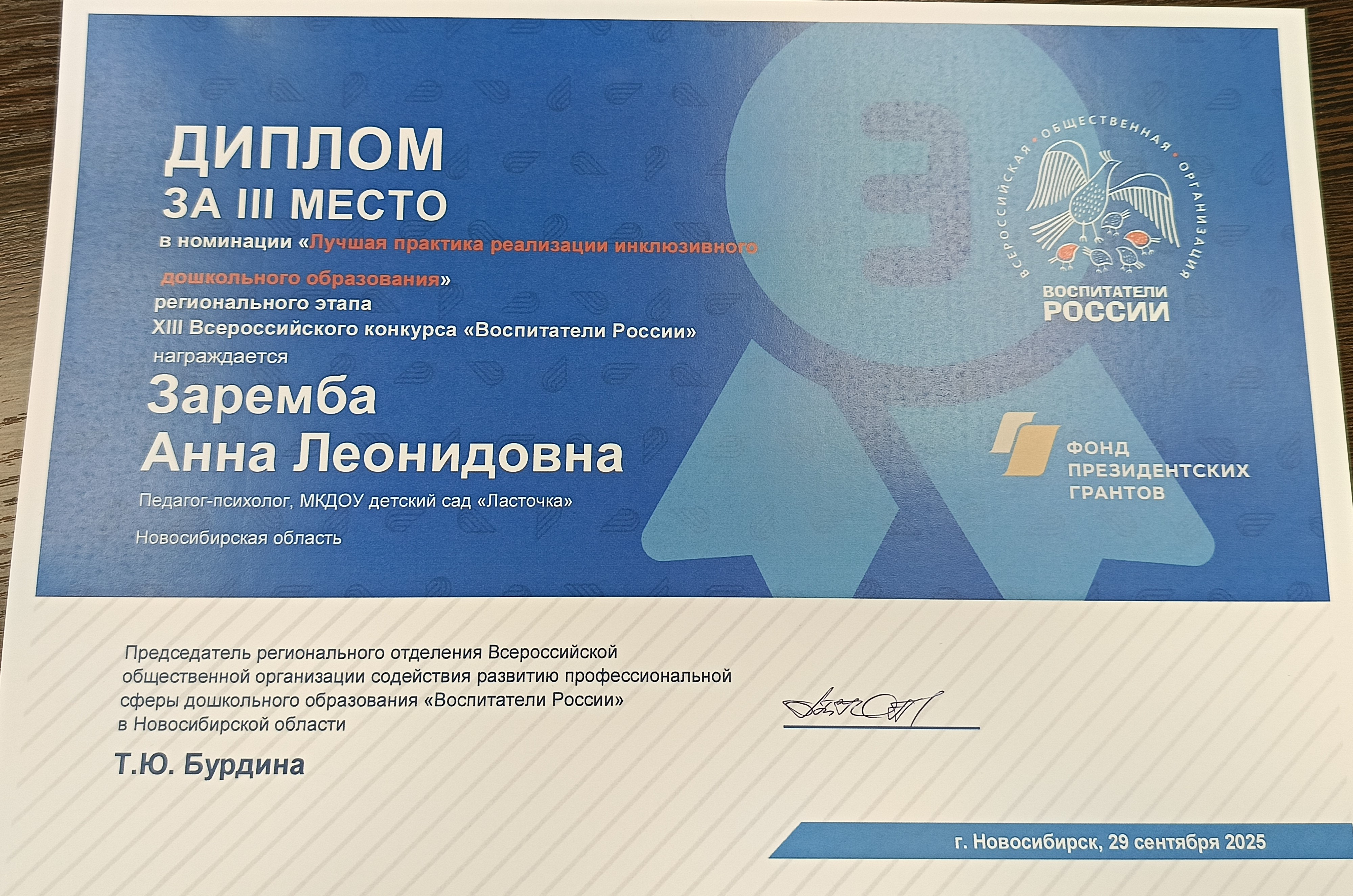Диплом за 3 место в номинации "Лучшая практика реализации инклюзивного дошкольного образования" регионального этапа XIII Всероссийского конкурса "Воспитатели России"